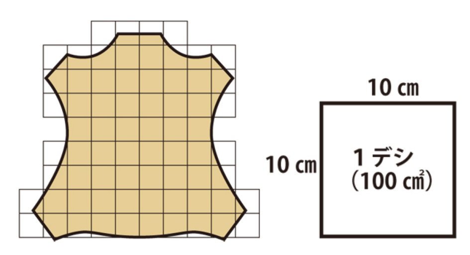 日本における皮革の取引単位デシ/DSで、1DS=100㎠(10cm×10cm)だぽこ♪