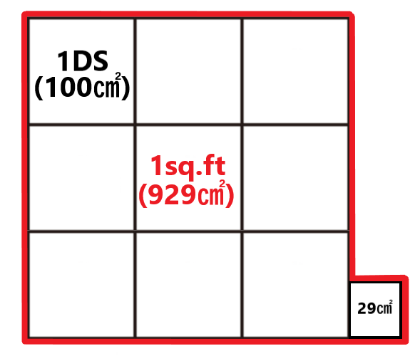 1DSが100㎠、1sq.ftが929㎠ということは1sq.ftは1DSが9.29個分なので、1sq.ftをDS換算すると1sq.ft=9.29DSになるということですね!