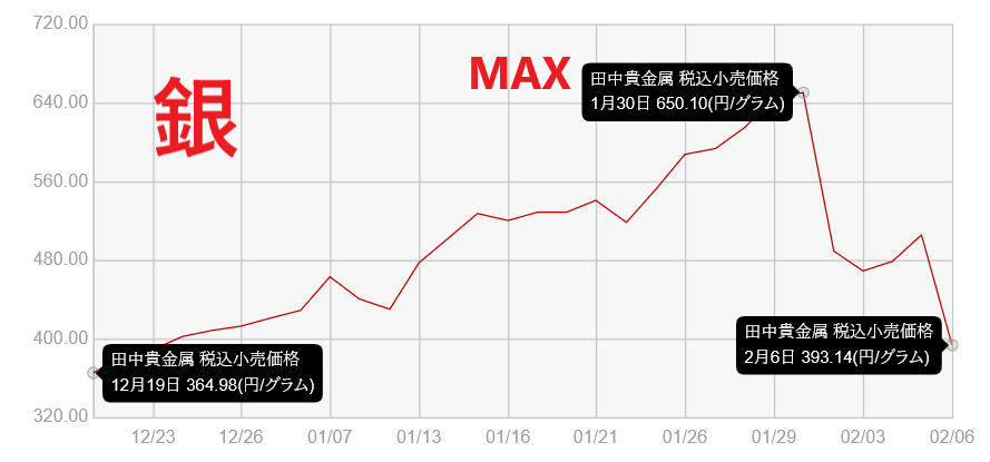 銀に関して言うと、最高値は650.10円/gまで高騰しましたが、393.14円/gまでガクッと下がってしまって、その下落率は約40%と地金価格の中でもトップです…