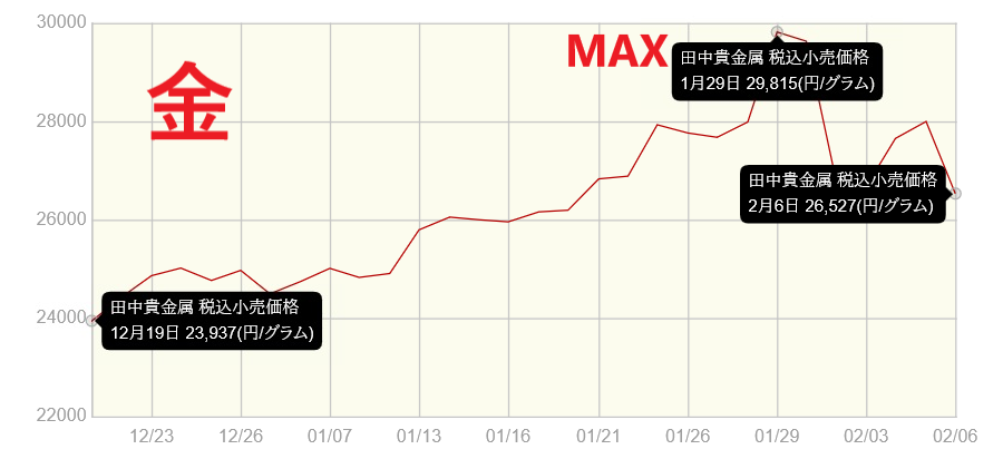 そして、金に関しては最高値29,815円/gから26,527円/g約11%の下落と他に比べるとまだマシで、12月19日時点と比べても結果的には上昇していると言えます