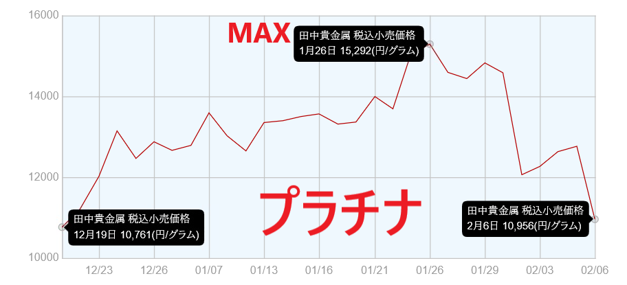 次に下落率が高いのはプラチナで、最高値15,292円/gから10,956円/g約29%の下落となっているぽん…