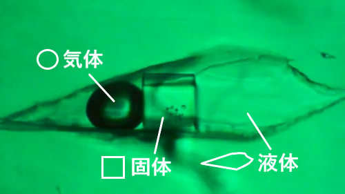 ――三相というのは気体・液体・個体の3つの状態のことを指し、液体で満たされた空間の中に気体と固体が閉じ込められて共存している内包物/インクルージョンのことを三相インクルージョンと呼びます――
